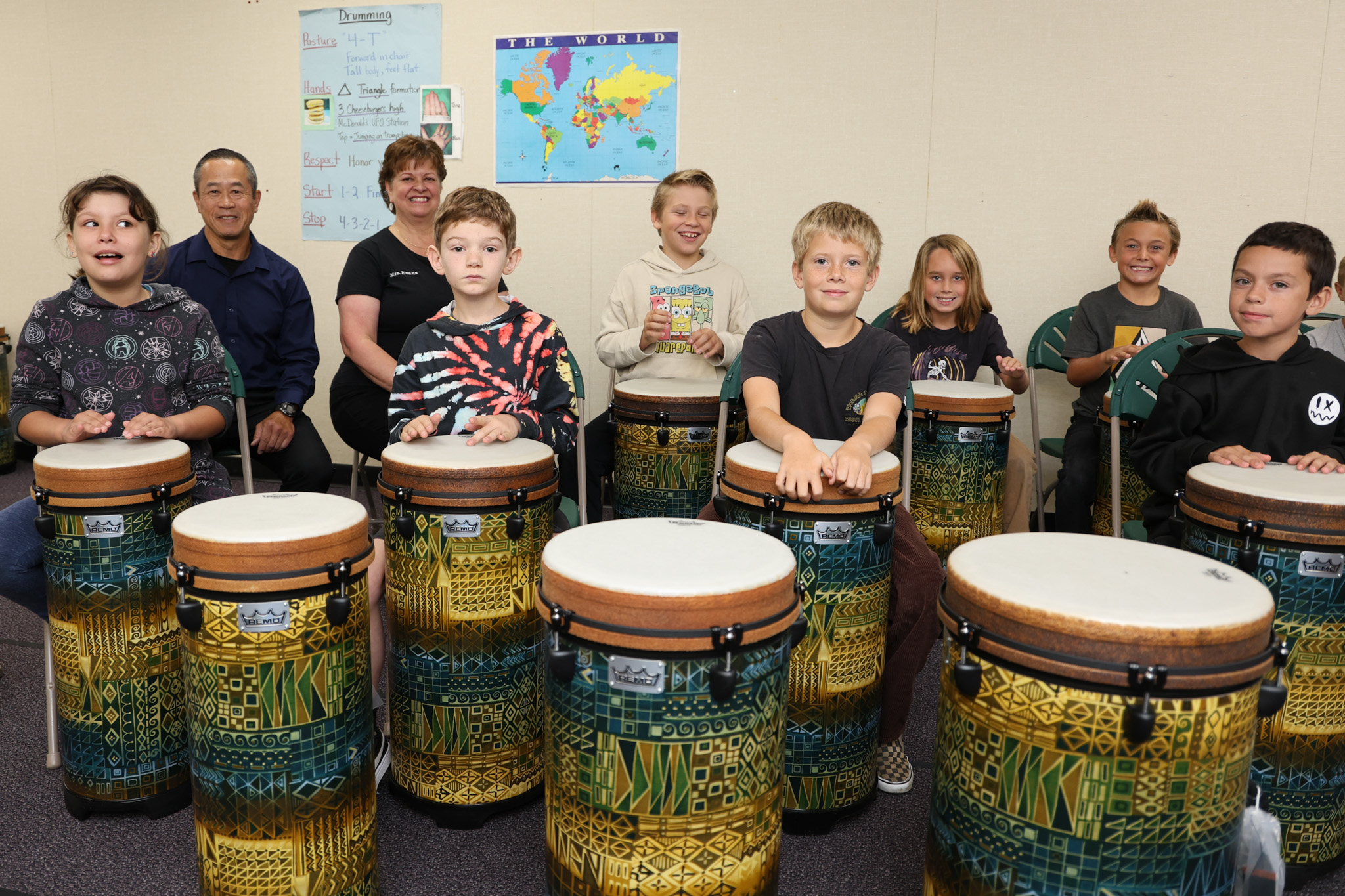 In May of 2024, CUSD elementary block music teacher Sharon Evans was notified that her grant proposal for $8,300 was approved. She intended to purchase nine sets of three sizes of Remo tunable tubano drums to teach students African drumming and provide a therapeutic outlet. The drums were delivered on Thursday, and Katherine Yang and Jennifer Niedringhaus from the Philharmonics education and community engagement department were able to help the students try them out for the first time.