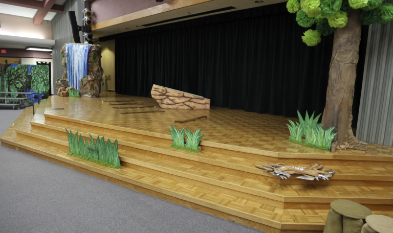 Students and volunteers helped paint vibrant backdrops, build set pieces, and prepare props that would transform the Wood Canyon Multi-Purpose Room into the African savanna. Costumes were carefully fitted, microphones tested, and lighting cues rehearsed. Teachers, parents, and staff worked side by side with the students, supporting every step of the creative process. Three staff members- Ellie Koutroulis, Maria Wilson and Nuria Robinson- led the way with their passion and spirit to keep the performance organized and on schedule, as well as maximize the fun.